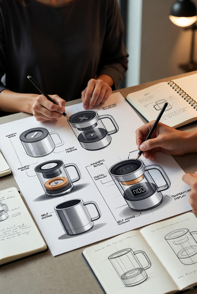 We wanted a mug that could think one step ahead: mix the drink for us and tell us when it was ready to sip. After dozens of sketches and early prototypes, SyncCup was born β a self-mixing mug with a magnetic rotor and a clear digital temperature display.